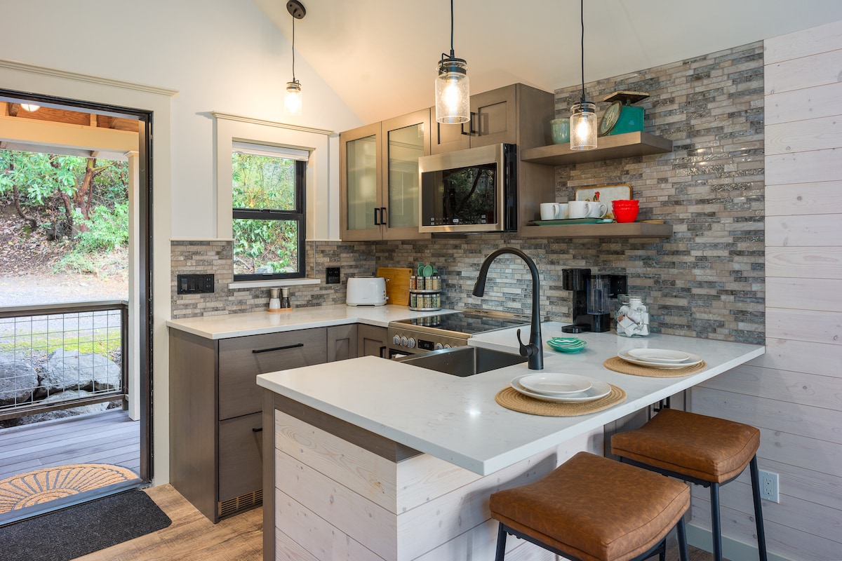 Salish Denizi'nin güzel manzarasına sahip büyüleyici kulübemiz, tek başına bir inziva veya bir çiftin kaçamağı için mükemmeldir. Restoranlara, mağazalara ve sahil parkına sadece kısa bir yürüyüş mesafesinde, her sabah güneşin doğuşuyla güverteden veya bu mükemmel tasarlanmış stüdyodaki rahat queen boy yataktan uyanırken kasabanın rahatlığının tadını çıkarabilirsiniz. Stüdyo kır evimizin özellikleri: ☀️ Yepyeni ev aletleri ☀️ Kuvars tezgâhlar ☀️ Özel fayanslı banyo ☀️ Lüks nevresim takımları ve olanaklar Ada kaçamağınız sizi bekliyor ✨