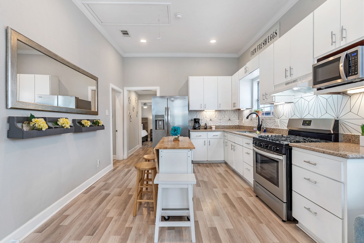 Uzun bir günün ardından eve geldiğinizi, yumuşak, rahat King boy yatağa gömüldüğünüzü ve aydınlık, havadar, modern bir dairede gece uykunuzu uyuduğunuzu hayal edin. Bunun da ötesinde, kahvaltı barınızda veya rahat kanepenizde tam donanımlı bir kahve istasyonunda şarap ve yemek için uyanabilirsiniz. Houston Heights'taki Radiant Relaxing Retreat by Snooze Stays'de konaklamak böyle bir şey. Hasta, iş profesyoneliyseniz veya ailenizi görmek için seyahat ediyorsanız mükemmel yeri buldunuz.