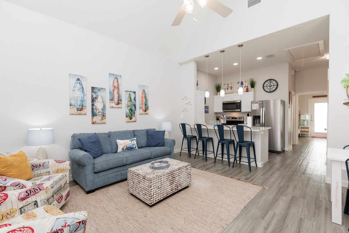 Dillon Bay is in Aruba Bay Resort, just 1.5 blocks from the beach! This 3-bedroom (all upstairs), 3-bath townhome sleeps 10 and includes a sleeper sofa and full bath downstairs. Fully furnished with beach décor, it has a stocked kitchen and private patio for relaxing. Resort amenities include a clubhouse with game room, 2 heated pools, pickleball court, fishing pier, and boat slips for rent. Book your island getaway today!