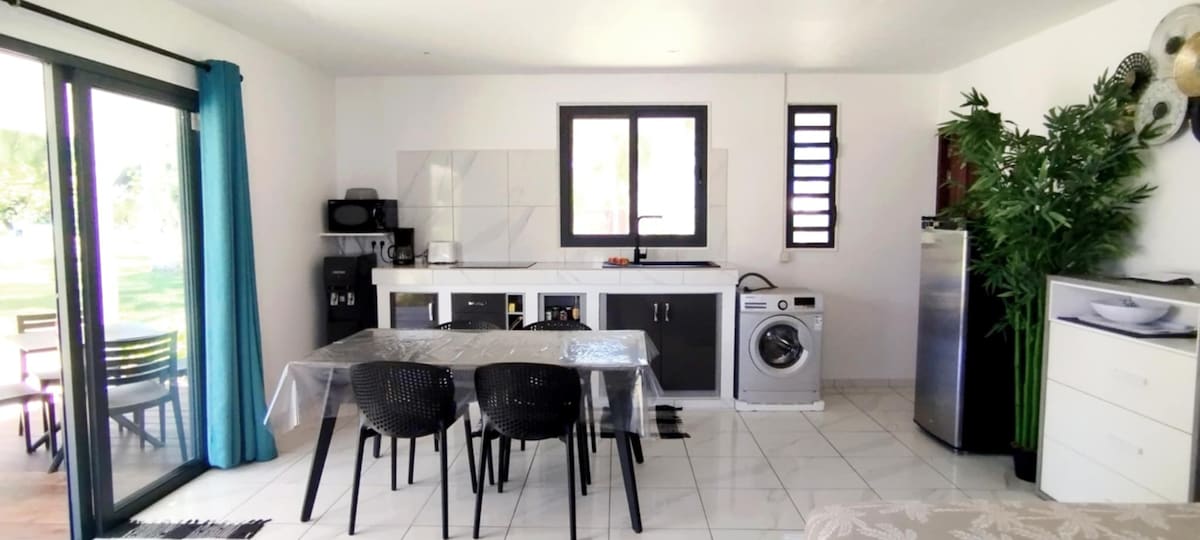 Özel bir mülkte, deniz kenarında, bağımsız dubleks bungalov. 1 1 büyük çift kişilik yataklı + 1 çekyatlı klimalı oda. Mutfak ve banyo alanı. Su kenarında bahçede özel dış teras. Faré'den 100 metre uzaklıktaki kumul ve 800 m uzaklıktaki Taapuna sörf noktasına erişmek için 2 kano mevcuttur. Uluslararası / adalar arası havaalanı arabayla 10 dakika mesafede. 24 saat açık süpermarket 10 dakika yürüme mesafesinde. Yakınlarda restoranlar, atıştırmalıklar ve karavanlar.