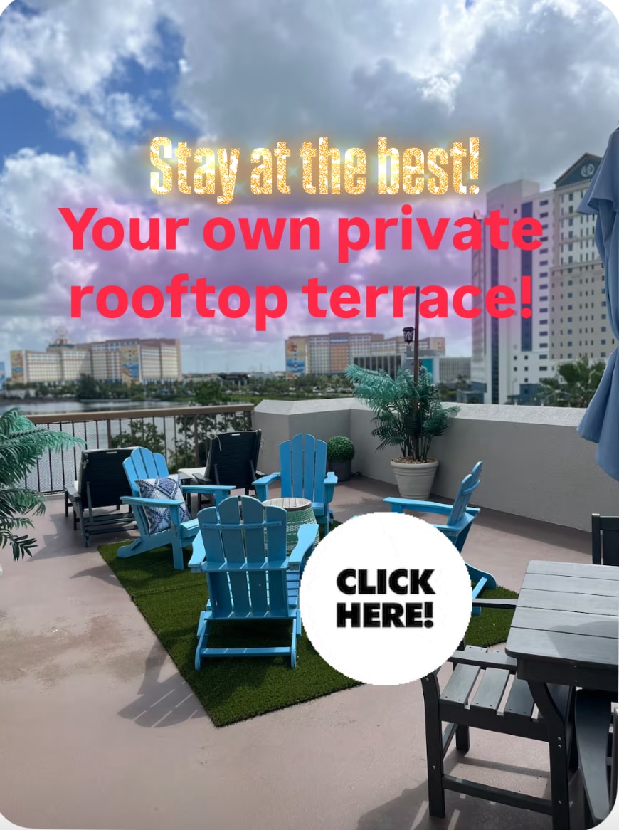 Bu süitte özel giriş, oturma odası, mutfak gereçleri ve tencere seti bulunan mutfak, king boy yataklı bir yatak odası ve özel banyo bulunmaktadır. Üçüncü ve dördüncü kişiler, oturma odasında düz bir şekilde queen boy yatağa dönüşen koltukla konaklayabilir. Ayrıca çift kişilik bir şişme yatak ve portatif beşik de mevcuttur. Disney, Universal, SeaWorld ve plajlar için mükemmel bir konum. Disney'e yaklaşık 35 dakika, Universal'a 27 dakika, kongre merkezine 23 dakika, plaja 45 dakika ve havaalanına 35 dakika.