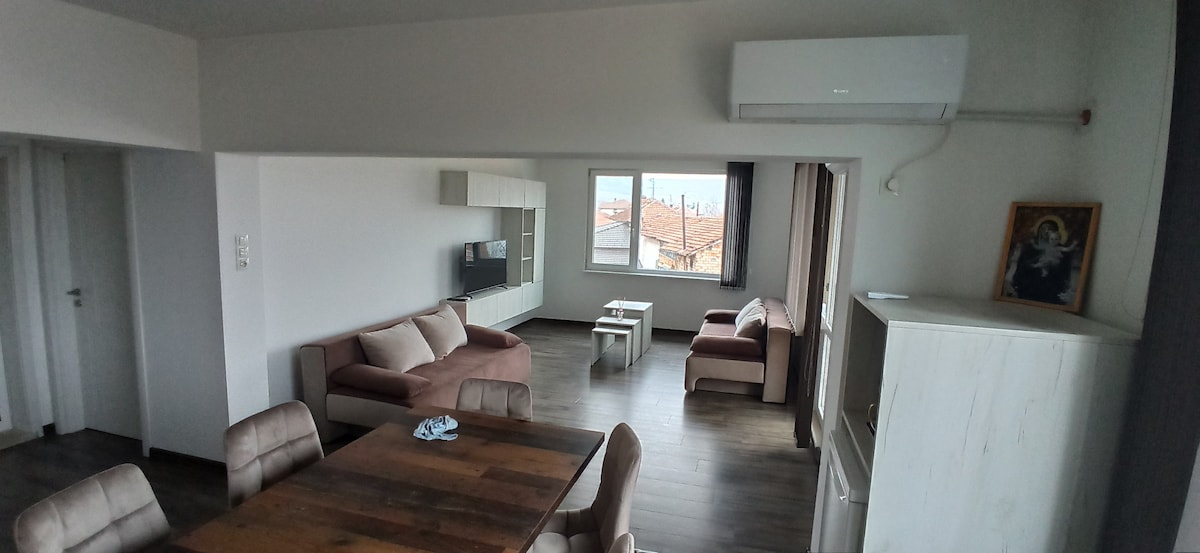 Pleven'in merkezinde rahat özel daire. Dairede iki büyük yatak odası, büyük bir oturma odası ve mutfak, tuvaletli bir banyo ve iki büyük teras bulunmaktadır. Merkeze 5 dakika yürüme mesafesindedir ve Pleven Tıp Üniversitesi'ne 5 dakika yürüme mesafesindedir. Dairede çalışmak için ayrı bir yer, tam donanımlı bir mutfak, klima ve konvektör, TV ve kablosuz internet bağlantısı, buzdolabı, ocak, çamaşır makinesi ve havlu bulunmaktadır! Bu özel yer her yere yakın, bu da konaklamanızı planlamayı kolaylaştırıyor!