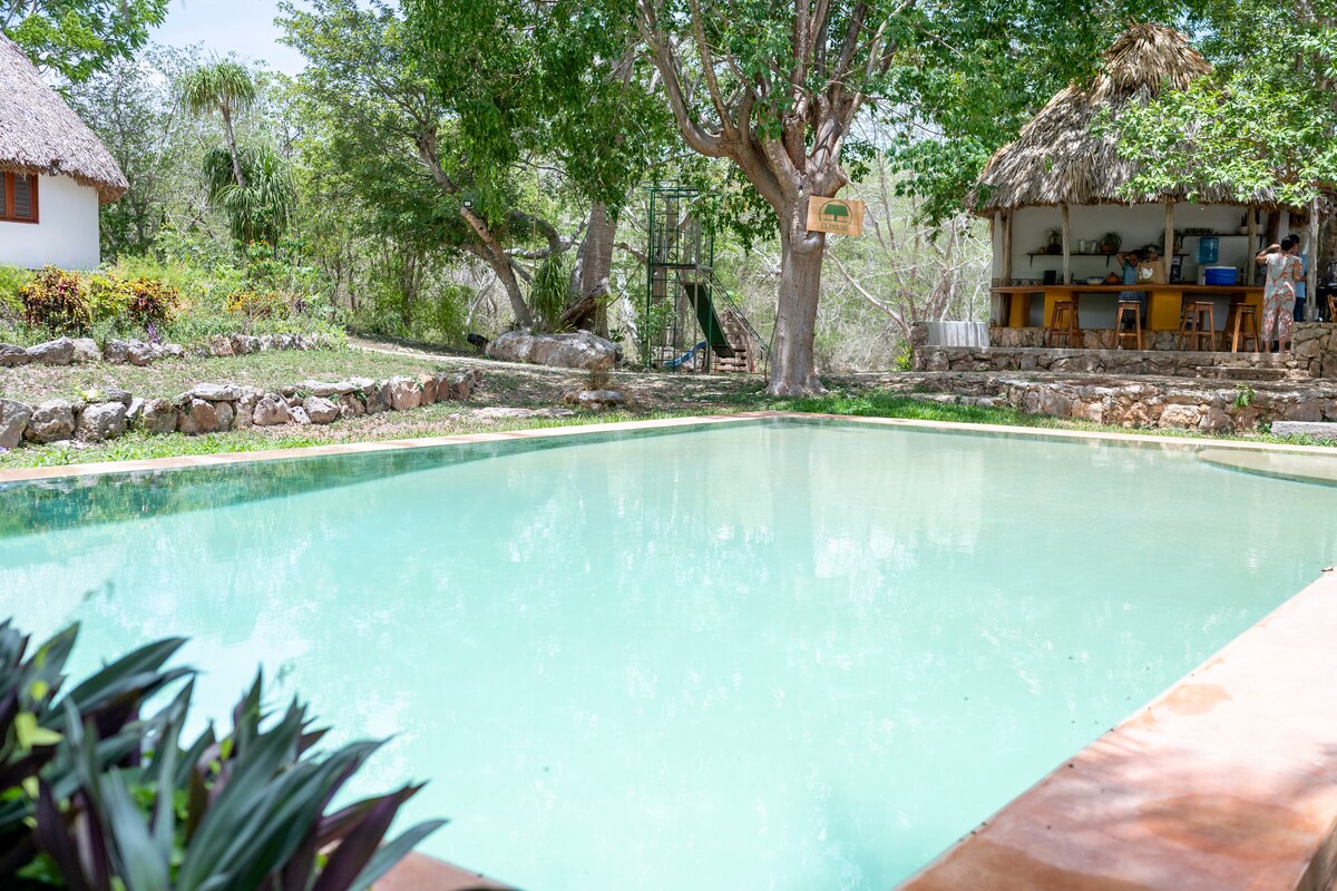 🌿 Izamal ve Büyülü Cenoteler arasında Rustik Kabin Rustik cazibenin bilinçli yaşamla buluştuğu sakin bir dinlenme yeri olan Hacienda ICH-KI'ya hoş geldiniz. İzamal ve Yucatán'ın en güzel cenotelerinden bazıları arasında yer alan çevre dostu kabinimiz sizi doğayla yeniden bağlantı kurmaya, yavaşlamaya ve derin nefes almaya davet ediyor. Kuş cıvıltılarıyla çevrili huzurlu sabahların tadını çıkarın ve sevgiyle ve yerel malzemelerle hazırlanmış vejetaryen yemeklerimizin tadını çıkarın. Doğayı, sadeliği ve otantik Yucatán deneyimlerini seviyorsanız aradığınız yer burası. 🌺