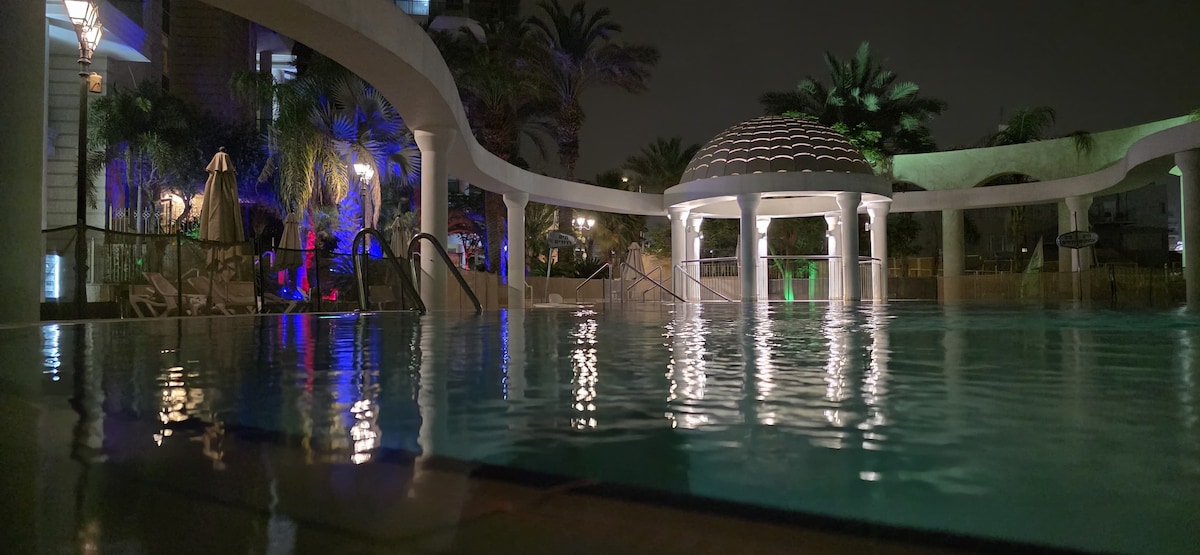 "Sapphire Lakshari" Süit – özel avlusu, mevsime göre ısıtılmış havuzu olan lüks ve sessiz bir bahçe dairesi, havuzun içinde tam bir mahremiyet vardır, havuz çıkışında gizlice çıkma seçeneği vardır (ilgilenenler, konuyla ilgili doğru bilgi için bizimle iletişime geçin) ve Eilat Körfezi ve Edom Dağları'nın muhteşem manzarası vardır. Dairede her biri çift kişilik yataklı 2 yatak odası, beşinci misafir için şilte ekleme seçeneği, 70" akıllı TV'li bir oturma odası, tam donanımlı bir mutfak (indüksiyon ocağı, fırın, entegre buzdolabı, espresso makinesi), her odada akıllı TV'ler, duş ve tuvalet bulunmaktadır. Bir çift veya çocuklu bir çift için uygundur, partiler için değil. Ücretsiz özel park yeri.