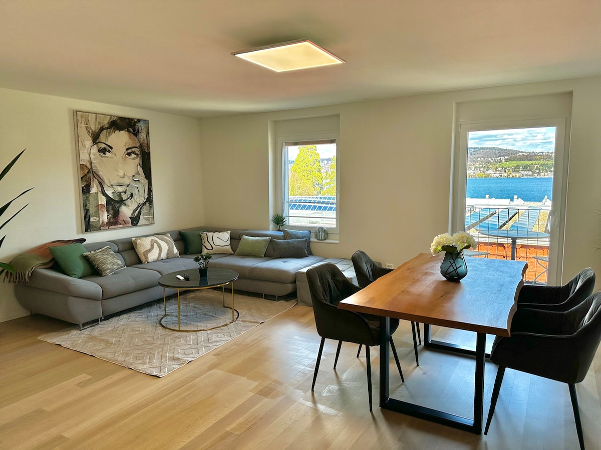 Daire güzel ve güneşlidir, zarif, sessiz bir semtte (havaalanına 30 dakika, ana istasyona 20 dakika) bir evin birinci katına yayılmıştır. 4,5 özenle dekore edilmiş oda, iki masalı bir ofis, oturma odası, iki yatak odası, modern mutfak ve banyo, hepsi güneş ve gün ışığı. Balkon muhteşem bir manzara olan Zürih Gölü'ne bakıyor. Zürih: temiz hava, temiz sular, mükemmel toplu taşıma, muhteşem spor ve kültürel olanakların yanı sıra önemli bir etkinlik ortamı.